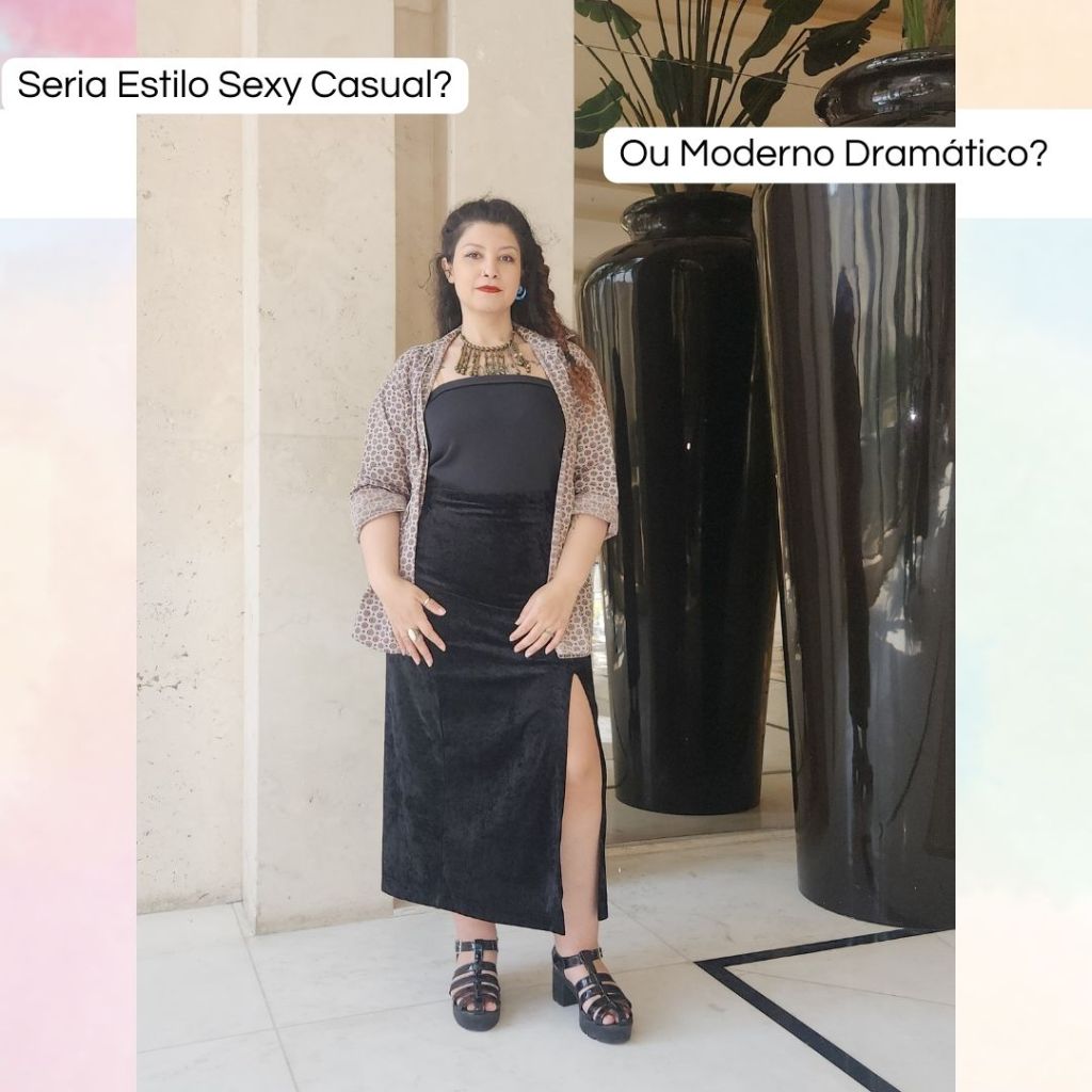 Se pensarmos nos principais elementos podemos associá-lo melhor ao Estilo Sexy Casual ~em uma interpretação mais ampla dos Estilos~: roupas justas no corpo, fenda, decote do top, batom vermelho. O Casual fica por conta da camisa social estampada oversized como terceira peça. O Dramático Moderno podemos ver nos acessórios: colar grande tipo “ouro envelhecido”, alargador azul, anéis grandes de pedra, sapato tipo tratorado, talvez até texturas da saia e top.